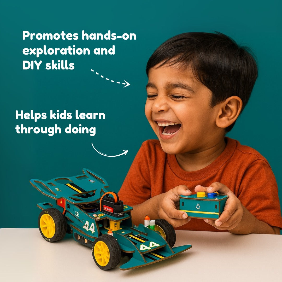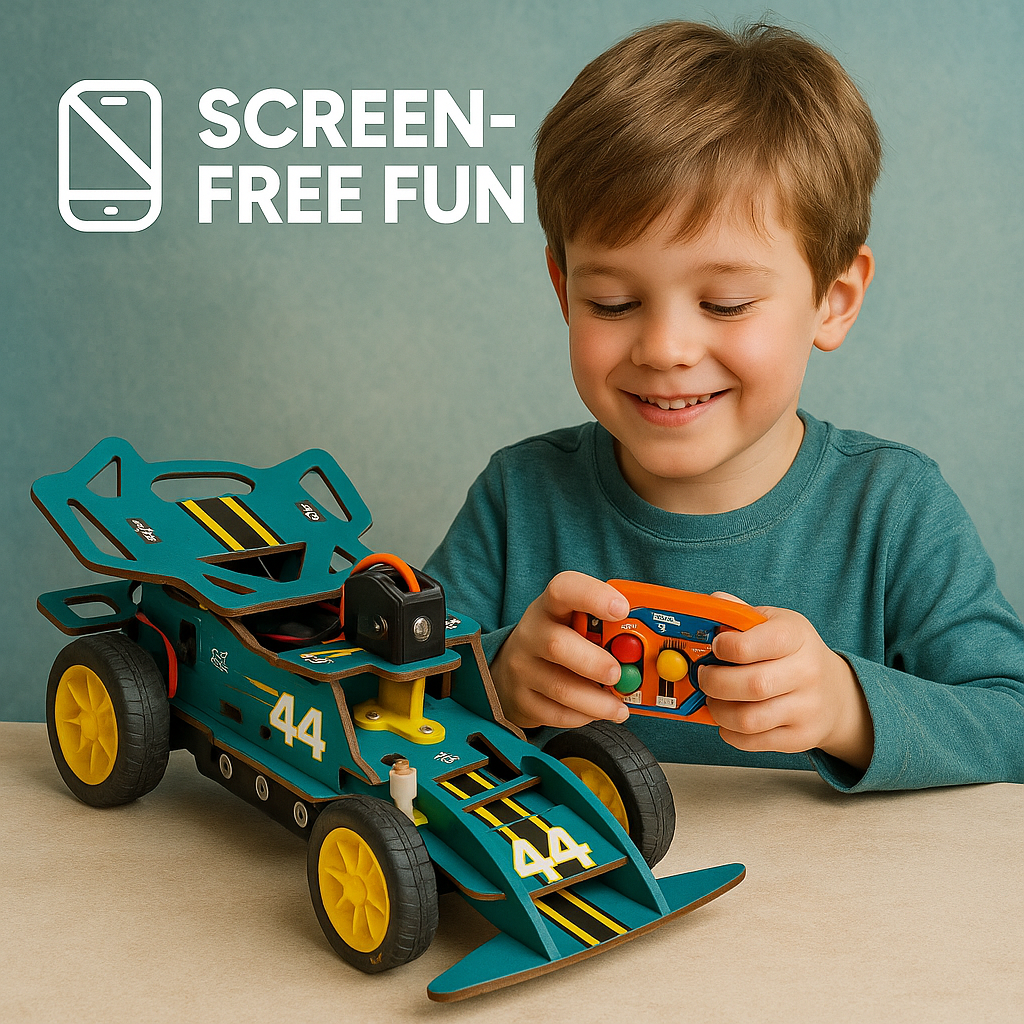With easy-to-assemble wooden parts, safe electronics, and a wireless remote, kids can build, race, and learn at the same time. Designed for ages 6+, it combines STEM learning + racing thrill in one kit.